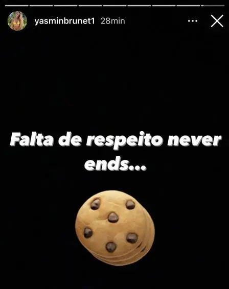 Em uma imagem de fundo preto, a modelo também colocou imagem de biscoito para alegar que, nesse caso, a "falta de respeito never ends". Logo depois, a publicação foi apagada para dar lugar a uma foto das mãos do casal.