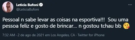 Enquanto isso, já para encerrar a situação, Letícia publicou o último tuíte sobre o assunto. "Pessoal não sabe levar as coisas na esportiva!", argumentou.