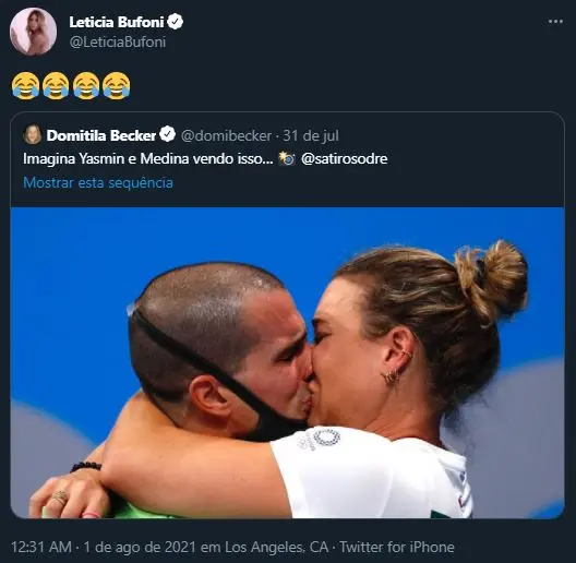 Letícia utilizou o Twitter para escrever postagem irônica sobre o casal, lembrando que o nadador Bruno Fratus conseguiu beijar a esposa, treinadora do atleta, em meio à comemoração por medalha de bronze nas Olimpíadas.