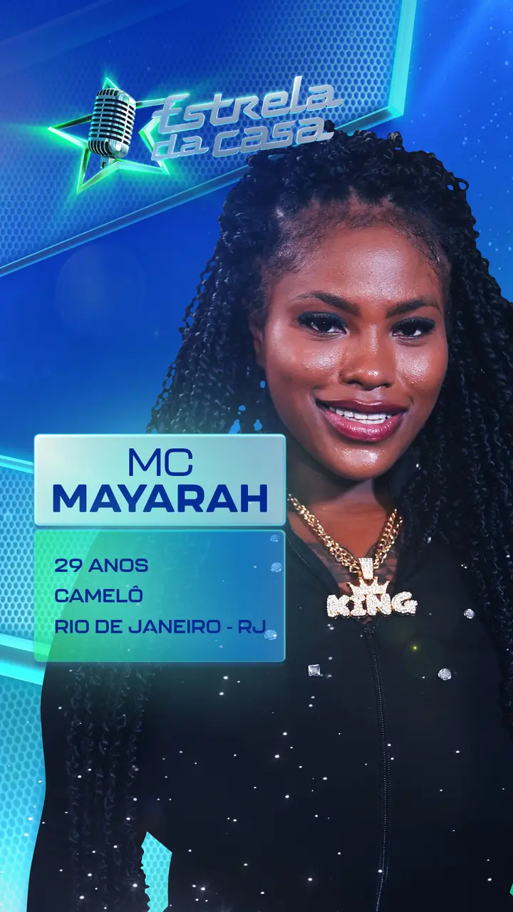 MC Mayarah é moradora de uma comunidade em Santa Cruz, no Rio de Janeiro, e tem 29 anos. Além de música, ela ainda faz trabalhos como camelô e tem como inspirações Ludmilla, Anitta e SZA. "Quero viver da música e mudar a realidade do meu filho", disse ela, revelando que é casada e tem um filho de 6 anos.