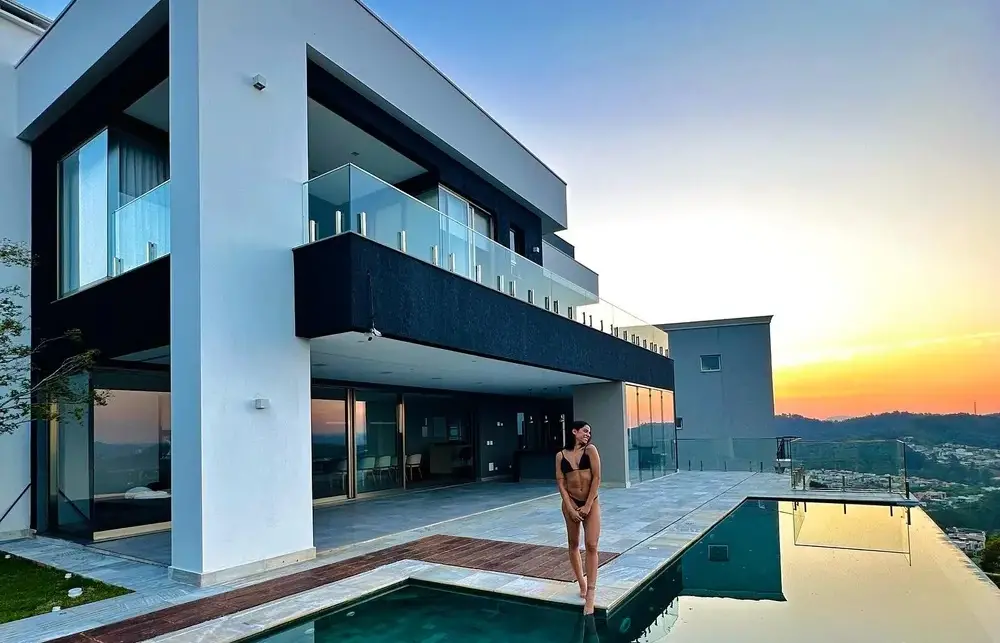 A casa tem dois andares, piscina de borda infinita, mesa de jantar feita com um tronco de madeira, sacada contínua, sauna, lareira e uma área gourmet. No instagram, a ex-BBB mostrou os diversos cômodos do novo lar.