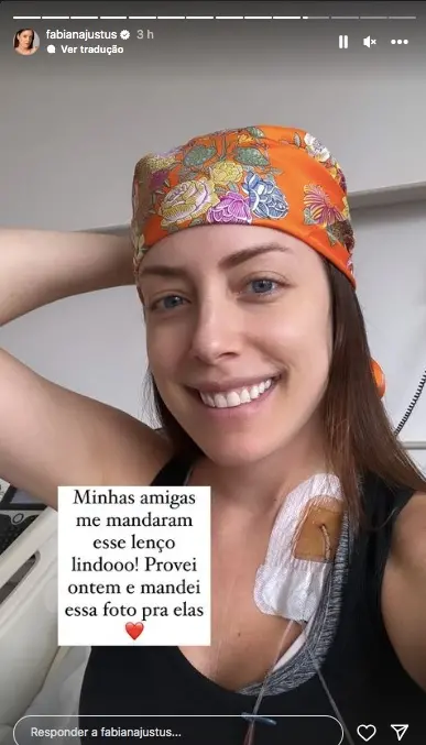 A influenciadora digital Fabiana Justus contou, nesta quinta-feira (8), que seus cabelos estão caindo de forma mais intensa, e que ganhou um lenço de suas amigas para usar quando ficar careca.