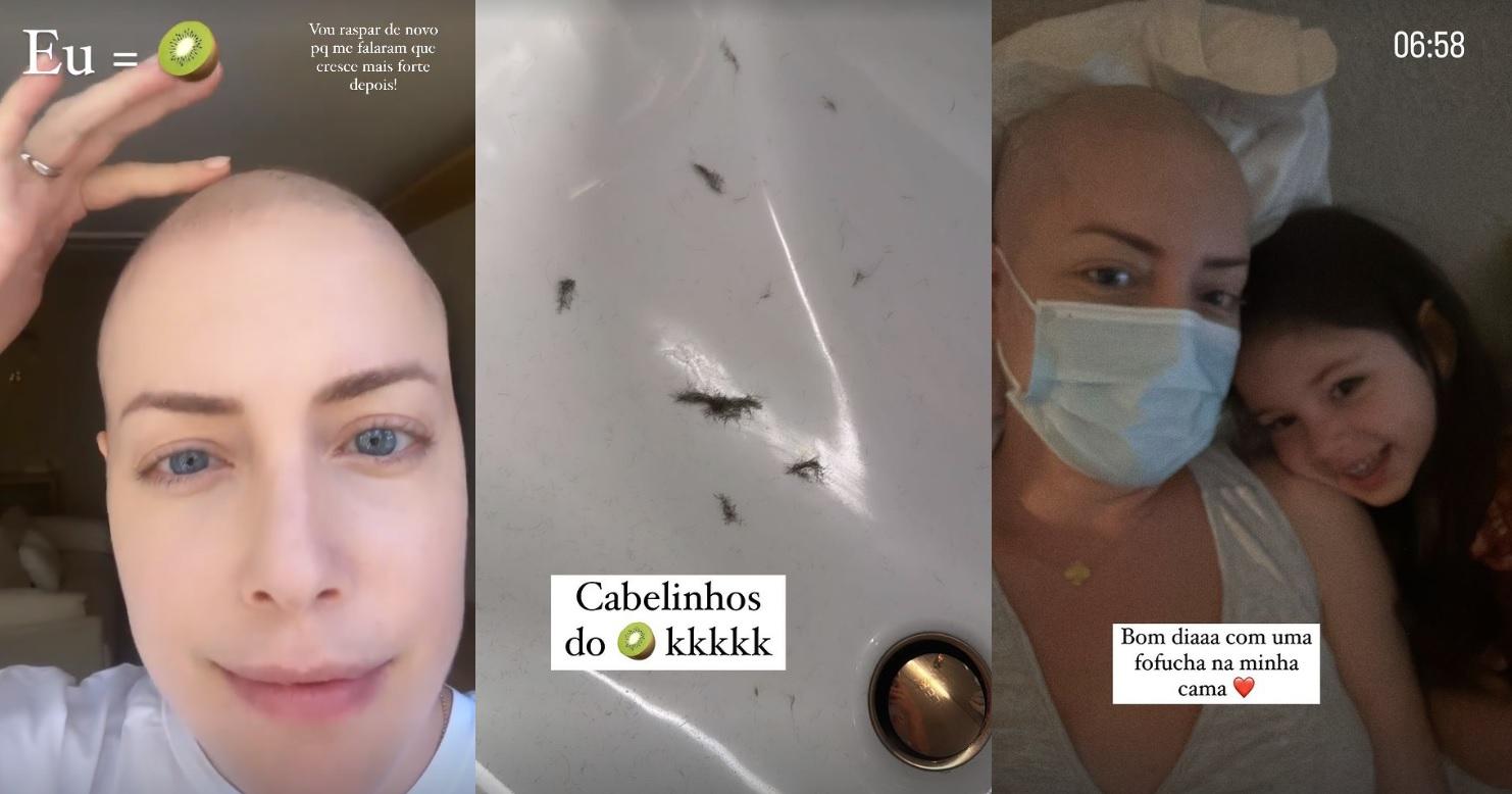 "Eu = [emoji de kiwi]. Vou raspar de novo, porque me falaram que cresce mais forte depois!", explicou Fabiana em um vídeo mostrando o cabelo voltando a crescer.