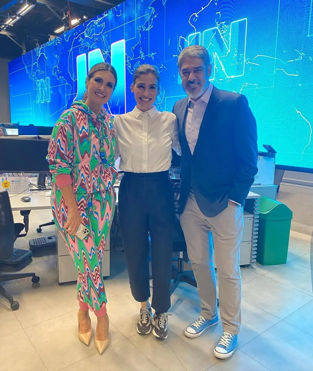 Fátima Bernardes retornou ao estúdio do Jornal Nacional nesta segunda-feira (20) para uma breve visita. Na ocasião, a apresentadora do The Voice Brasil ainda tirou uma foto ao lado dos jornalistas William Bonner e Renata Vasconcellos.