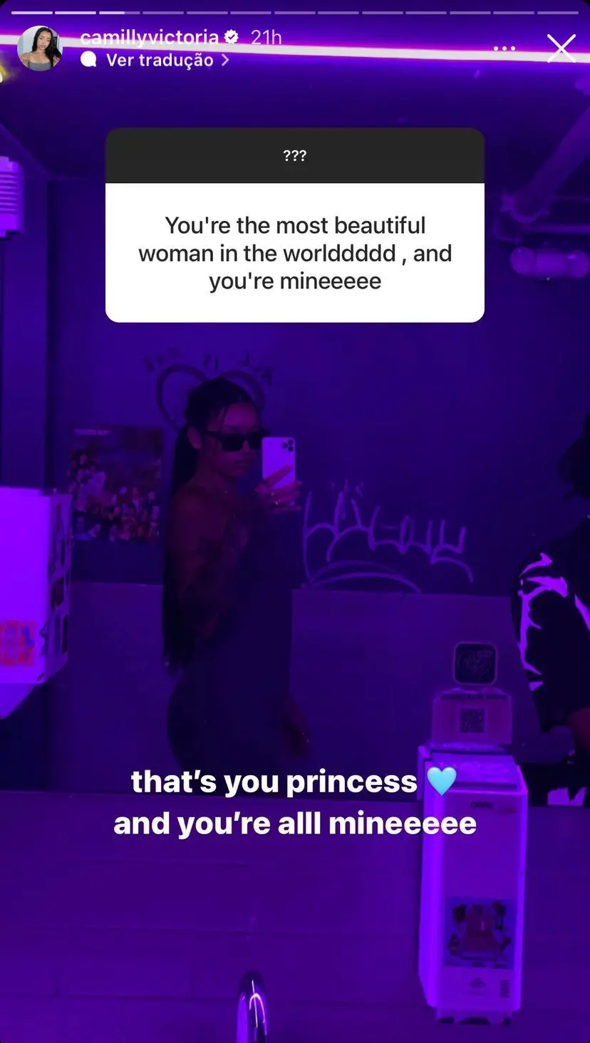 “Você é a mulher mais bonita do mundo e é minha”, escreveu Daze. Camilly respondeu com uma foto das duas, em que a amada aparece quase escondida, do lado direito: “Você que é, princesa, e você é toda minha”.