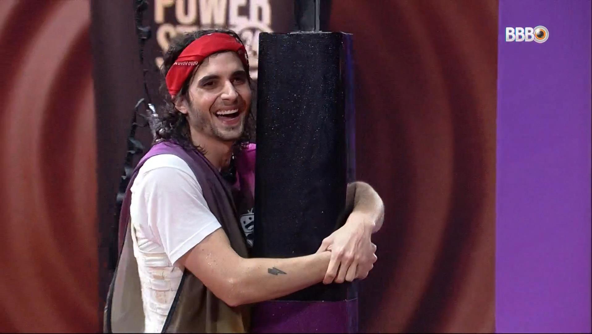 Na prova de resistência, os participantes precisaram aguentar ficar em pé e agarrados em batons gigantes que ficavam rodando contra água e vento.