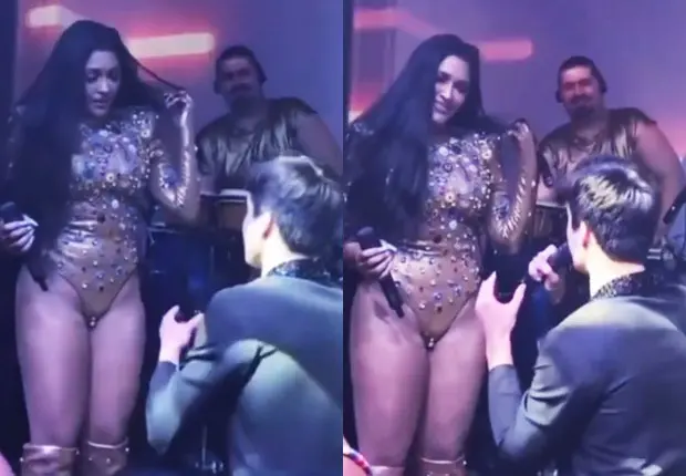 Ajoelhado, Pedro fez uma pausa na apresentação da amada, subiu ao palco com uma aliança na mão e pediu Flay em casamento. "Casa comigo, meu amor! Casa comigo! Eu te amo demais! Eu te amo demais!", disse aos prantos.