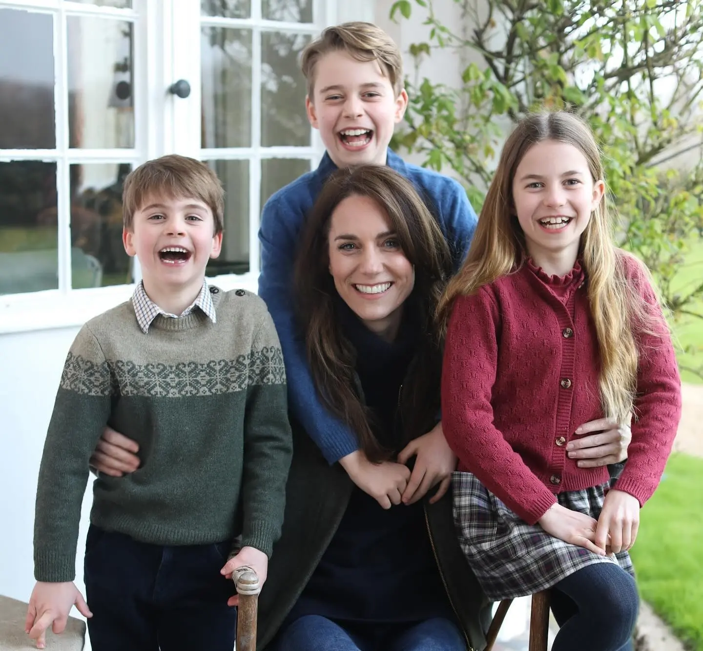 Na imagem publicada nas contas oficiais do casal nas redes sociais, Kate aparece sorrindo e cercada pelos três filhos, George, Charlotte e Louis, sentada em uma cadeira de jardim e vestida com jeans, um suéter e um casaco escuro.