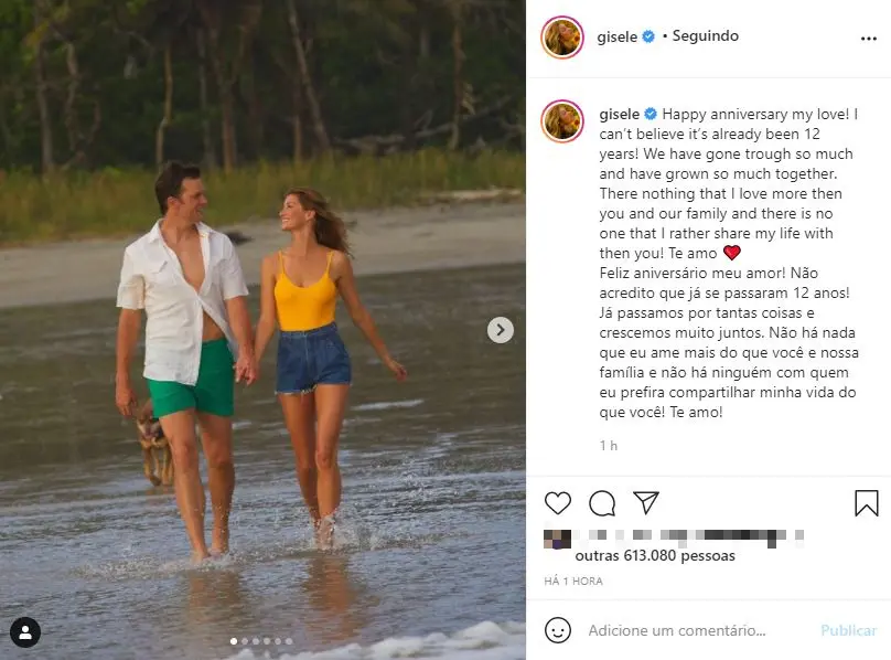 "Não acredito que já se passaram 12 anos! Já passamos por tantas coisas e crescemos muito juntos", escreveu ao parabenizá-lo pela celebração. Ainda na mesma publicação, Gisele ressaltou a importância dos filhos na vida do casal.