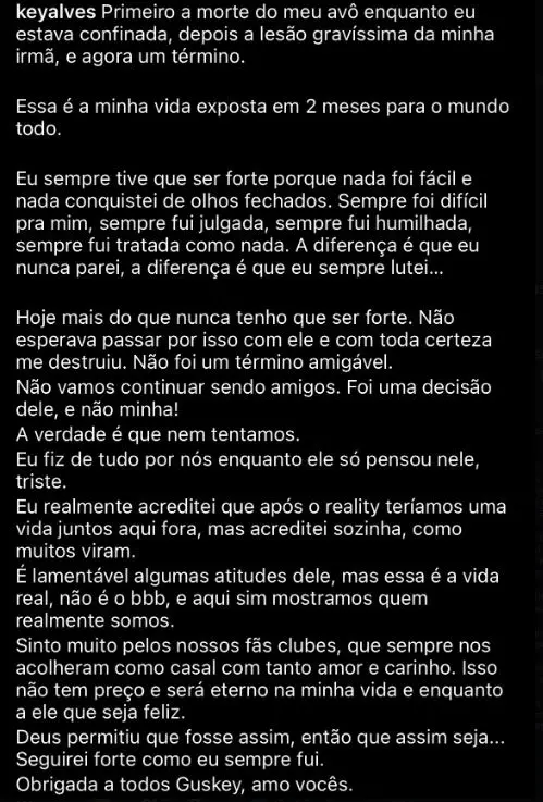 "Essa é a vida real, não é o BBB, e aqui, sim, mostramos quem realmente somos. Sinto muito pelos nossos fãs clubes, que sempre nos acolheram como casal com tanto amor a carinho. Isso não tem preço e será eterno na minha vida e, quanto a ele, que seja feliz", declarou Key.
