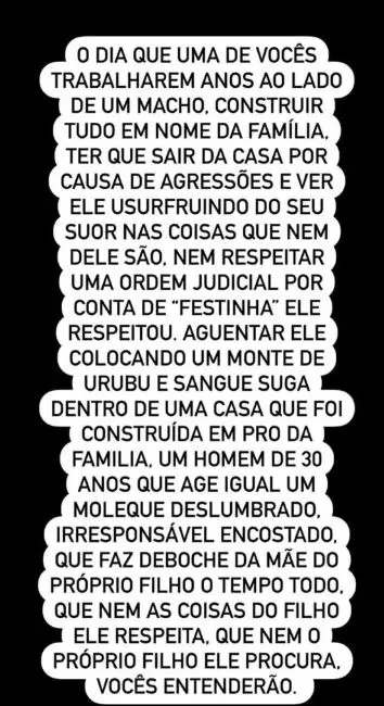 “O dia que uma de vocês trabalharem anos ao lado de um macho, construir tudo em nome da família, ter que sair de casa por causa de agressões e ver ele usufruindo do seu suor nas coisas que nem dele são... Nem respeitar uma ordem judicial por conta de uma ‘festinha’ ele respeitou”, explicou ela em logo texto no Intagram.