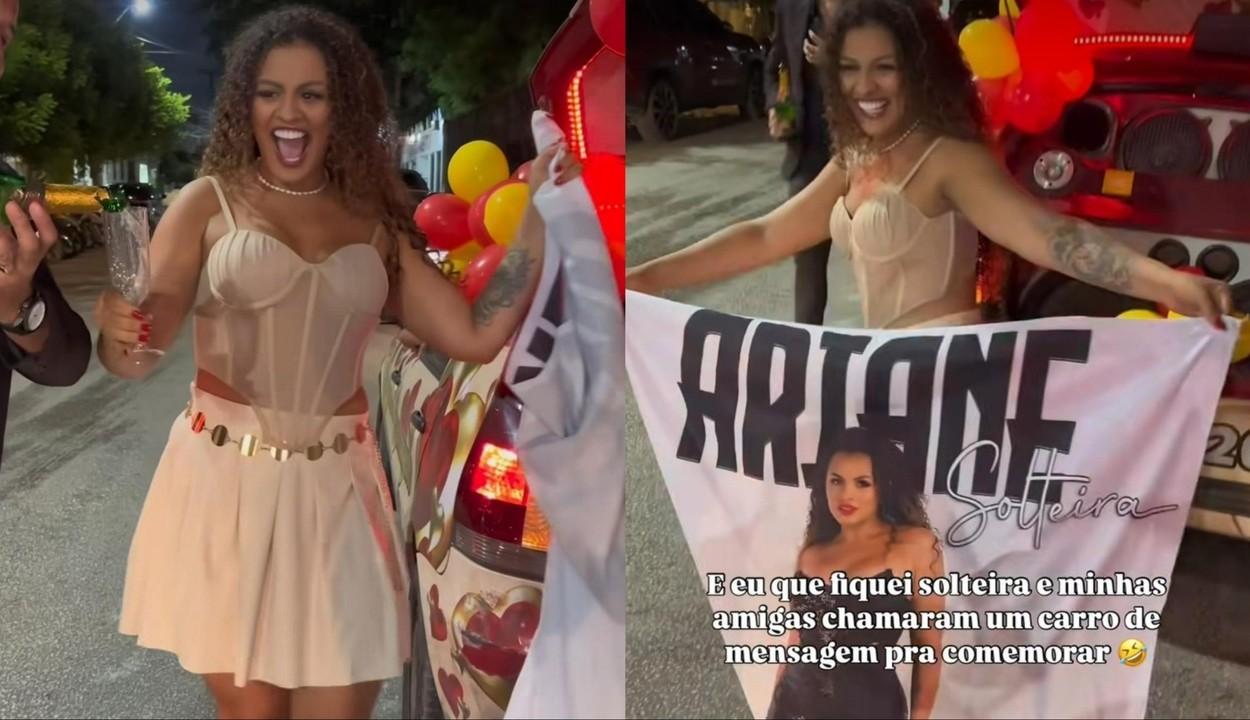 Surpresa, Ariane se divertiu com a mensagem e compartilhou o registro do momento nas redes sociais. "Minhas amigas que chamaram o carro de mensagem pra comemorar que eu estou solteira. Será se meu relacionamento era bom?", brincou, em publicação feita no Instagram.