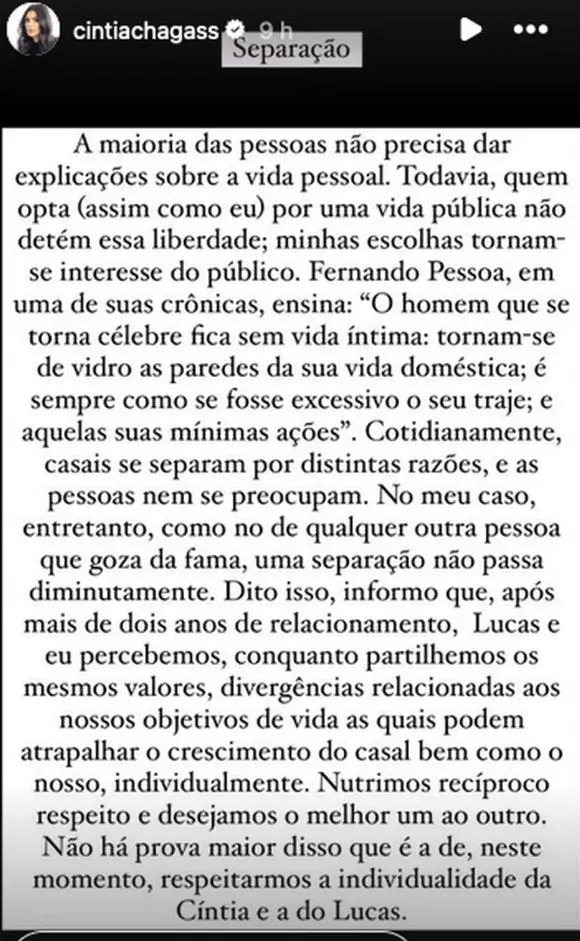 "Informo que, após mais de dois anos de relacionamento, Lucas e eu percebemos, conquanto partilhemos os mesmos valores, divergências relacionadas aos nossos objetivos de vida as quais podem atrapalhar o crescimento do casal bem como o nosso, individualmente. Nutrimos recíproco respeito e desejamos o melhor um ao outro", postou ela.