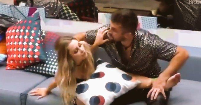 O casal aparece sentado conversando no sofá quando o brother chega a puxar a cabeça de Carla, que não responde às investidas.