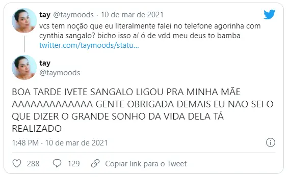 Horas depois, ela externou a felicidade com letras garrafais: "A IRMÃ DA IVETE SANGALO VIU ESSE TWEET VAI ROLAR EU YO (SIC) CHORANDO", festejou.