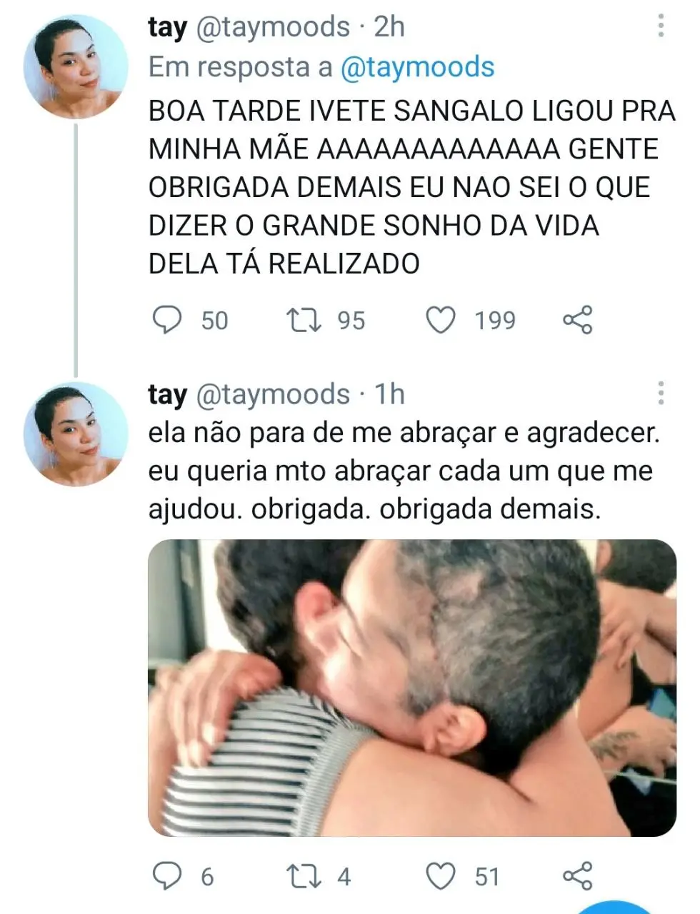 Também de acordo com a jovem, a artista desejou força e agradeceu por ela ser fã. A mulher, então, disse que a amava, e Ivete Sangalo afirmou que também a amava e que ama os fãs demais. A mãe ficou emocionada com a ligação surpresa: "não para de chorar de felicidade kkkkkk", externou.