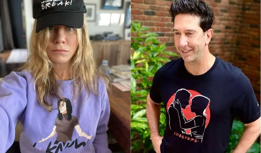 David Schwimmer publicou foto com uma camiseta estampada com as silhuetas dos personagens Ross e Rachel para promover a sitcom — e Aniston foi marcada na altura do coração do ator. O comentário da atriz foi especial: