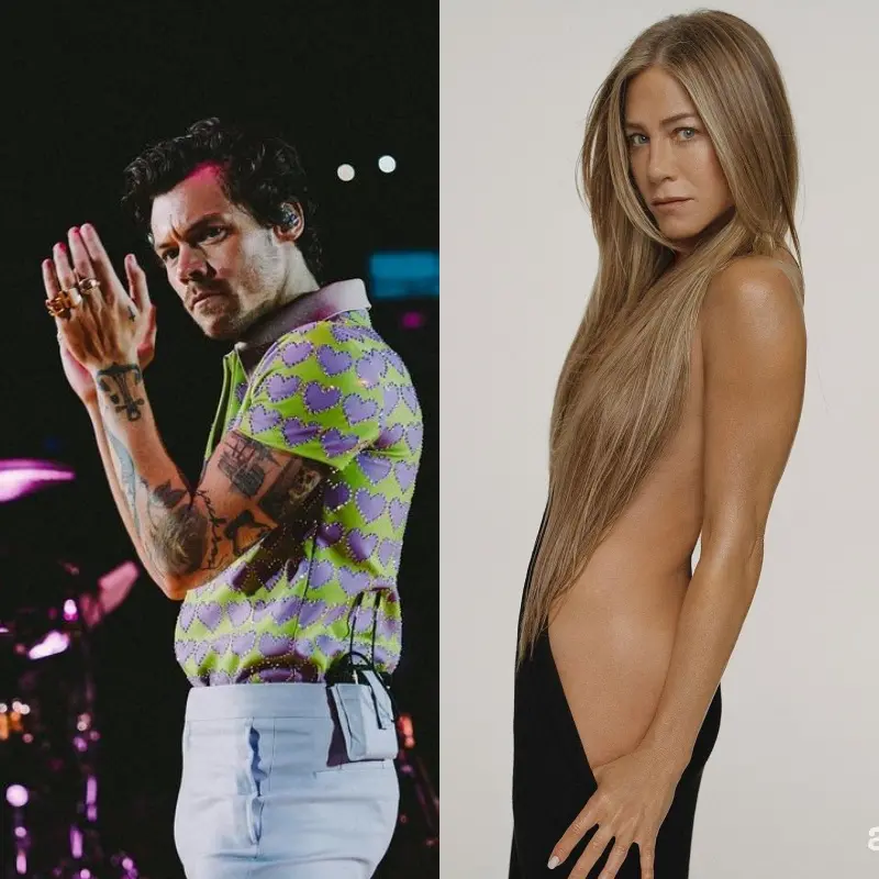 Jennifer Aniston, de 54 anos, e Harry Styles, 29, estão paquerando por mensagem, segundo o tabloide The Mirror. O contato entre os dois teria começado após a calça do cantor rasgar durante um show em Los Angeles, nos Estados Unidos, quando estava bem na frente da atriz.
