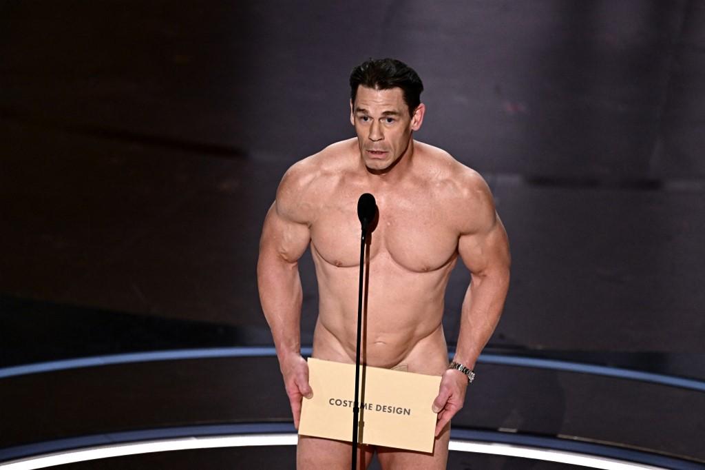 O ator John Cena surpreendeu o público, na noite desse domingo (10), ao apresentar "pelado" a categoria de melhor figurino do Oscar 2024. A brincadeira homenageou um episódio ocorrido em 1974, quando um homem sem roupas invadiu o palco da premiação.