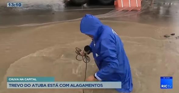 Um jornalista da afiliada da RecordTV no Paraná, a RICtv, caiu em um buraco na estrada, nessa terça-feira (18), enquanto fazia cobertura ao vivo de um alagamento na via. Tiago Silva mostrava a enchente registrada no Trevo do Atuba, em Curitiba, no programa Balanço Geral, quando despencou em uma cratera que estava coberta d'água.