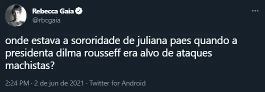 "Onde estava a sororidade de Juliana Paes quando a presidenta Dilma Rousseff era alvo de ataques machistas?", comentou uma usuária da plataforma ao lembrar do episódio que resultou no impeachment da petista.