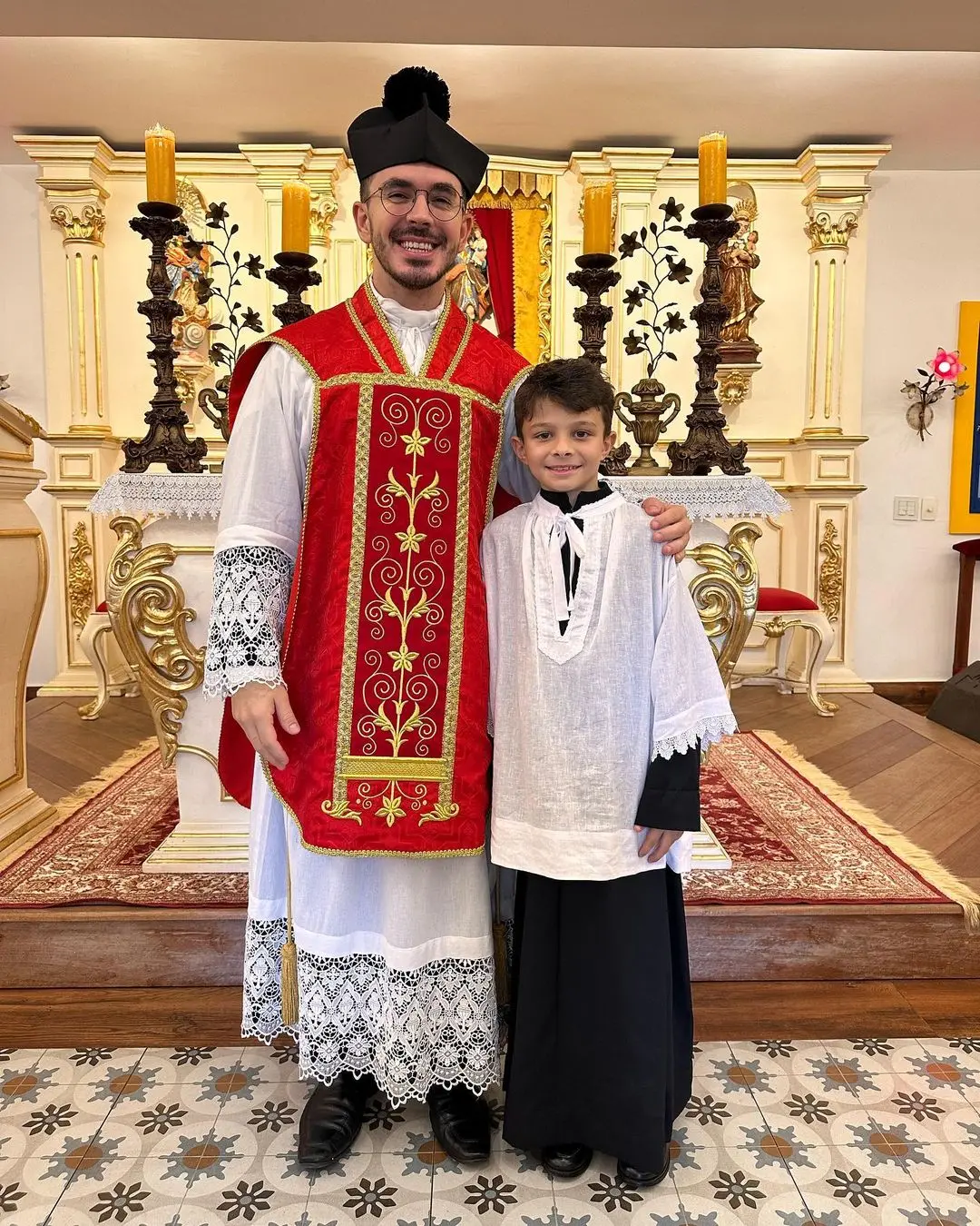 Juliano Cazarré compartilha foto do filho como coroinha: 'enche o coração do papai de alegria'