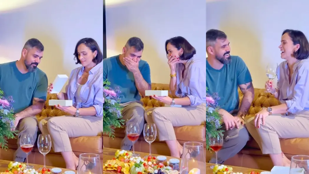O casal aparece sentado em um sofá, enquanto ela abre uma caixa com o teste positivo para a gravidez. Letícia e Juliano se abraçam e celebram a chegada do novo filho.