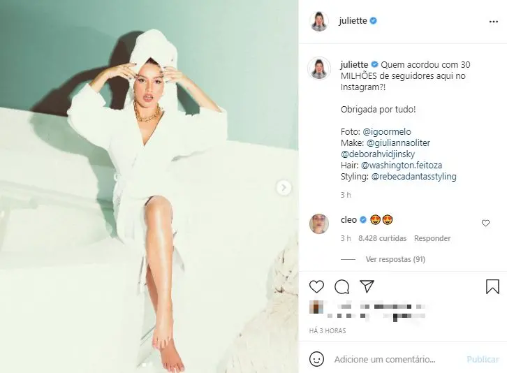 "Quem acordou com 30 milhões de seguidores aqui no Instagram?!", escreveu a advogada nas redes sociais, aproveitando para agradecer o carinho do público. Além do sucesso estrondoso, Juliette venceu a edição e levou R$ 1,5 milhão na final do jogo.