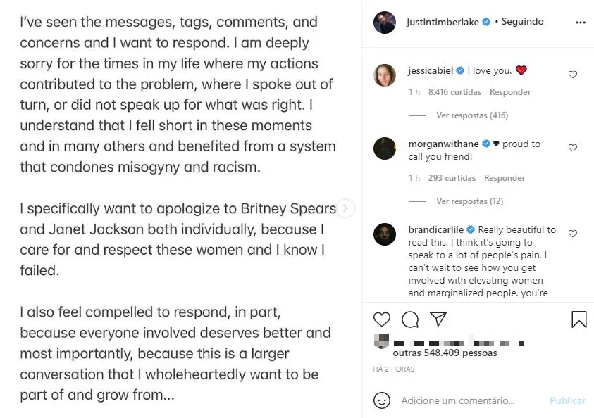 O cantor Justin Timberlake pediu desculpas à Britney Spears por meio de post no Instagram nesta sexta-feira (12). Os dois formaram um casal entre 1999 e 2002, com rompimento confirmado entre acusações de traições levantadas pelo artista.