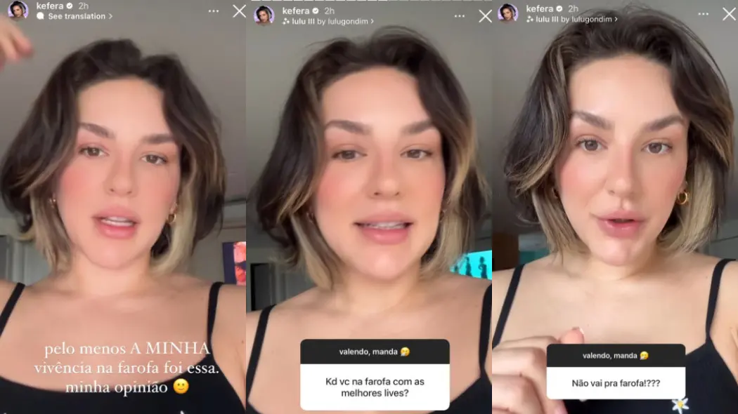 Kéfera contou ainda que retornou com o canal "5 Minutos" do YouTube. "Vou pra Farofa? Não vou. Fui convidada? Fui. Quis ir? Não quis. São outras prioridades. Ao longo da vida a gente vai mudando as nossas prioridades, vivendo de fato onde a gente quer estar e onde não tem necessidade. Entendeu? E é isso."