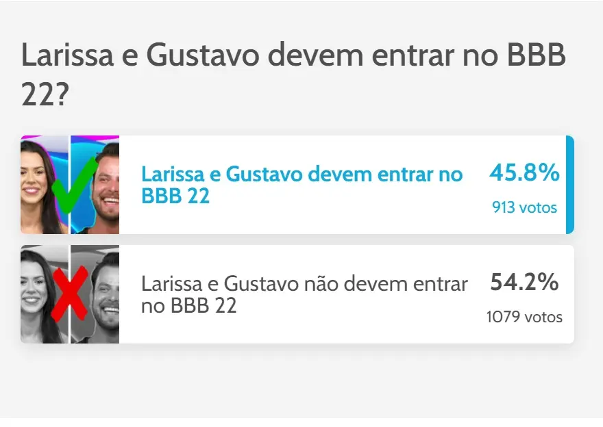 A coordenadora de marketing Larissa e o bacharel em direito Gustavo, confinados na casa de vidro do Big Brother Brasil (BBB) 22, podem não entrar no reality no domingo (13). Em enquete do Diário do Nordeste, o público não quer a entrada da dupla na casa.