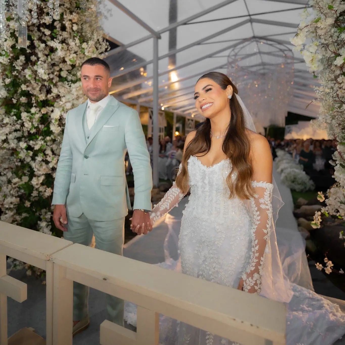 Lexa escolheu um vestido clássico e delicado, assinado pelo estilista Israel Valentim, com corte sem alças e luvas bordadas. A noiva chegou radiante e foi aplaudida pelos convidados ao caminhar até o altar. “Clássico e delicado”, definiu a cantora sobre o look.