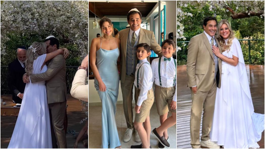 Sasha Meneghel, filha de Szafir com Xuxa, entrou de mãos dadas com os irmãos, os dois filhos do casal, Mikael e David. O marido da modelo, João Figueiredo, também prestigiou o casório.