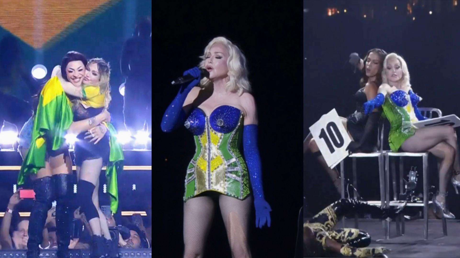 No telão, imagens de Gilberto Gil, Mano Brown, Marina Silva, Paulo Freire e Erika Hilton eram exibidas, enquanto Pabllo Vittar e Madonna dançavam com a bandeira brasileira em punho. A cantora brasileira ainda ousou e levantou Madonna nos braços.