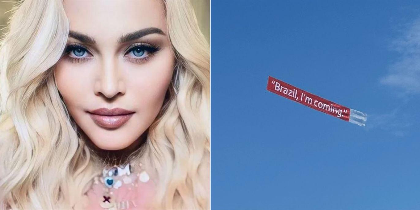 Um avião de pequeno porte com uma faixa escrita com a frase "Brazil, I'm coming", sobrevoou a orla de Copacabana, no Rio de Janeiro, nesta quarta-feira (20), aumentando os rumores sobre a chegada da cantora Madonna na cidade.