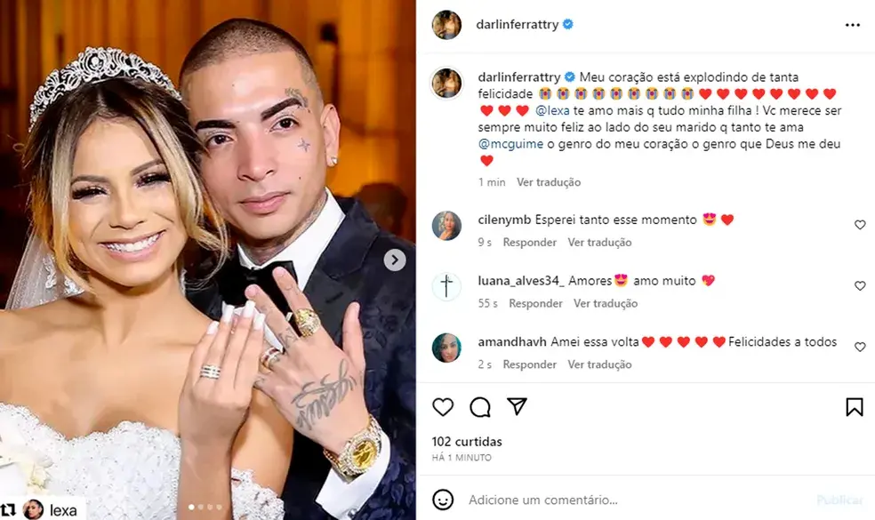 A mãe da cantora Lexa, Darlin Ferrattry, comemorou a reconciliação da filha com o ex-BBB MC Guimê, após os dois revelarem que o casamento foi reatado. A artista de 28 anos usou o Instagram, nesta sexta-feira (9), para anunciar o retorno do casal.