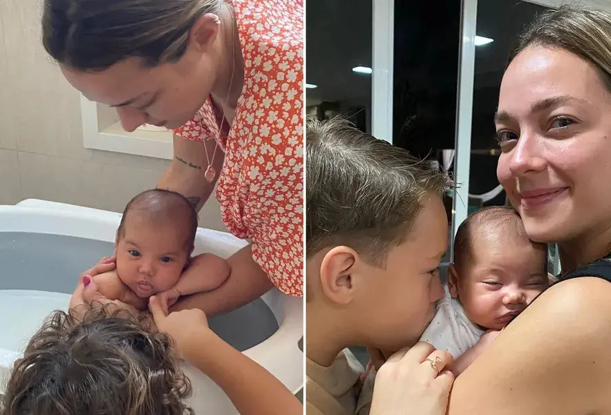 A influenciadora de 30 anos compartilhou os registros no Instagram. Em uma das fotos, ela aparece dando banho na pequena.