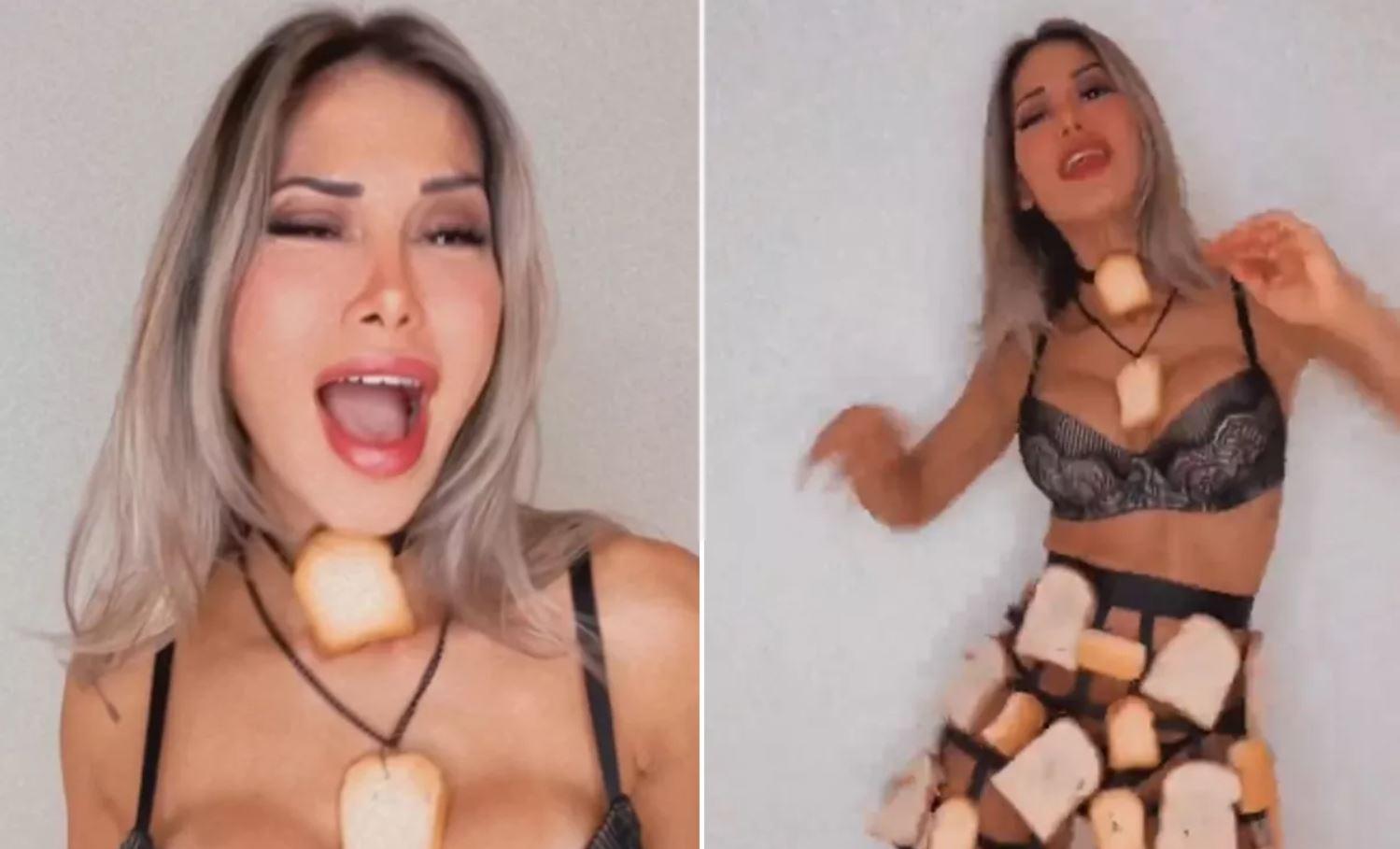 Maíra Cardi dança com roupa feita de pães para divulgar nova música de Arthur Aguiar