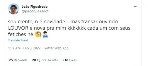 "Sou crente, não é novidade. Mas transar ouvindo louvor é novo pra mim (risos). Cada um com seus fetiches, né?", escreveu no Twitter, arrancando risadas dos seguidores e usuários da plataforma.