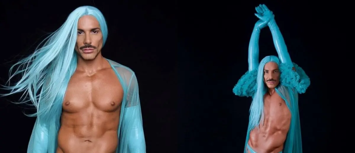 O look de Matheus consistiu em uma sunga, um roupão transparente, além de peruca e bota de cano alto.