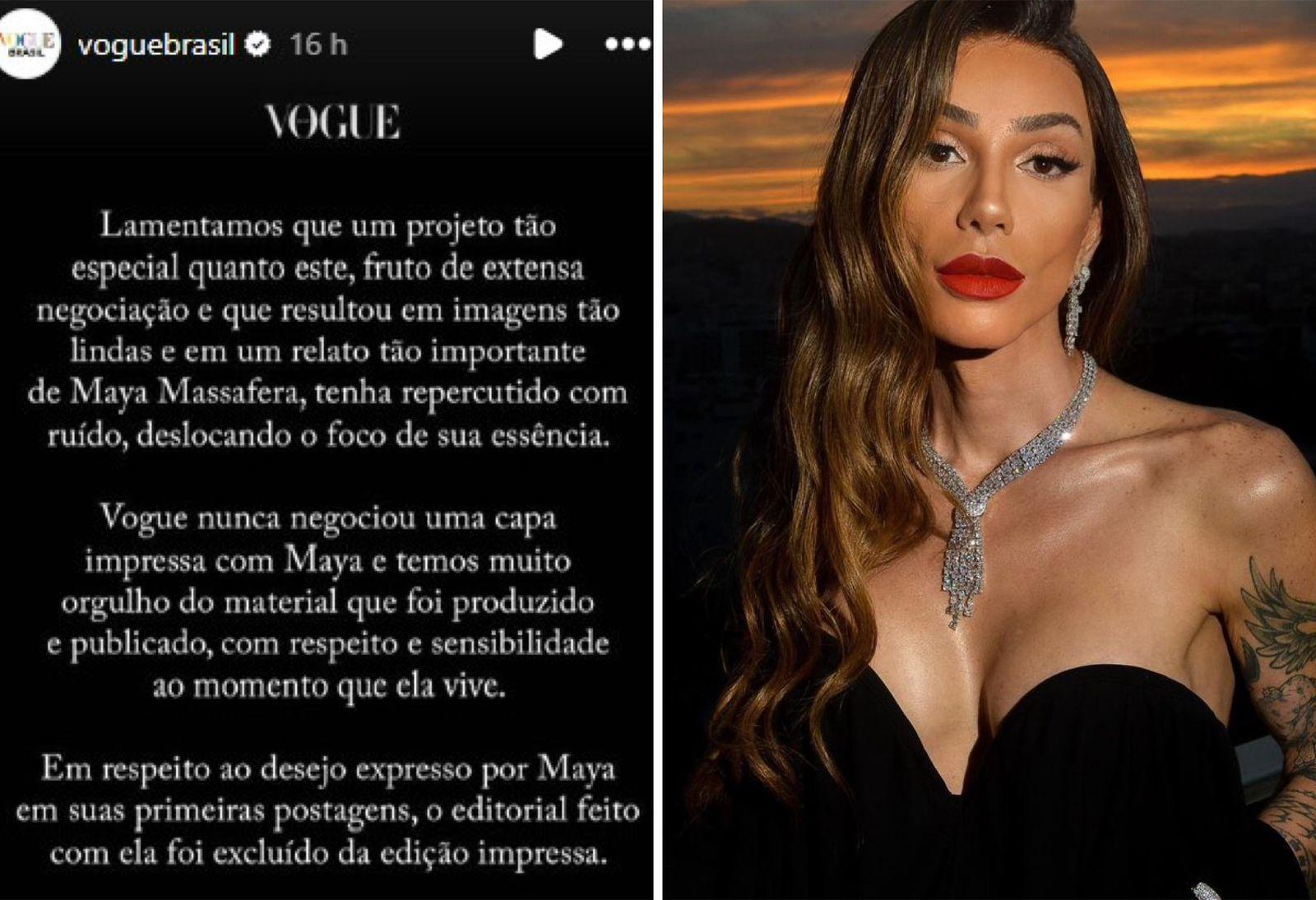 "Lamentamos que um projeto tão especial quanto este, fruto de extensa negociação e que resultou em imagens tão lindas e em um relato tão importante de Maya Massafera, tenha repercutido com ruído, deslocando o foco de sua essência", informou a publicação, em nota divulgada nesse sábado (1º), no Instagram.