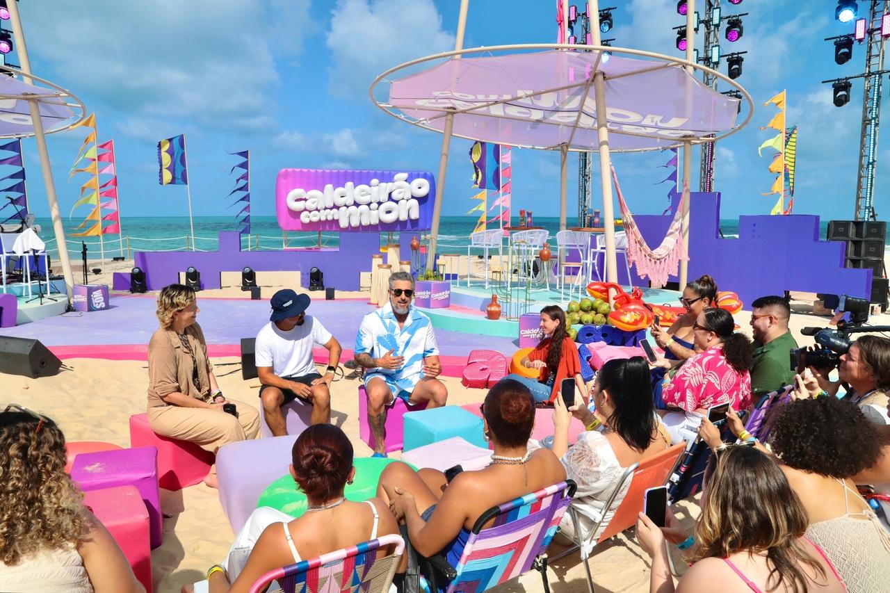 Pé na areia, sol forte e muita disposição. Esses foram os ingredientes de Marcos Mion e de toda a equipe do "Caldeirão" para um dia de gravações extenso em Aquiraz, na praia de Porto das Dunas, na segunda-feira (25). Jornalistas, influenciadores e convidados foram recebidos na arena do programa, desenvolvida especialmente para a edição de verão, e puderam acompanhar o trabalho em terras cearenses.