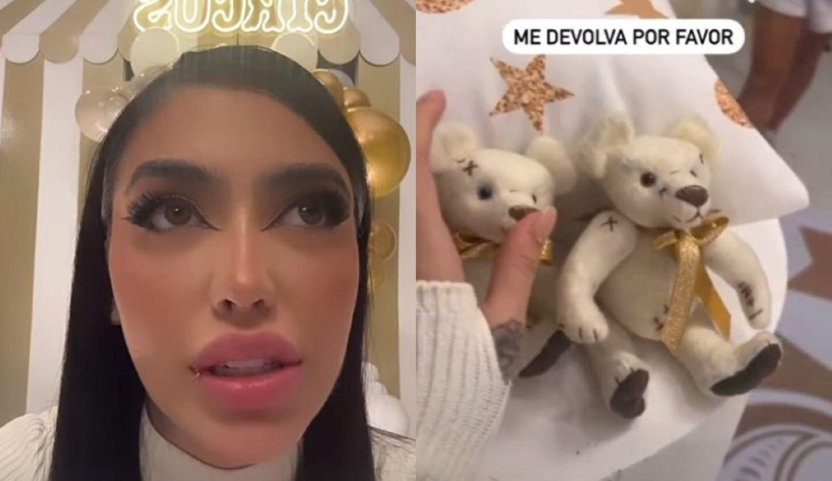 "Pode devolver meus ursos. O que é isso, nem pede, sai com a decoração levando embora! Tá louco? Vocês parem de ser sem noção, que vocês vêm para festa e saem pegando e levando embora a decoração, levando meus ursos embora, que são meus e da decoradora. Vocês são doidos? Eu quero meus ursos de volta, quem pegou faça o favor de devolver. Pode mandar no Uber, mandar um motoboy. Não quero saber, pode devolver", continuou.