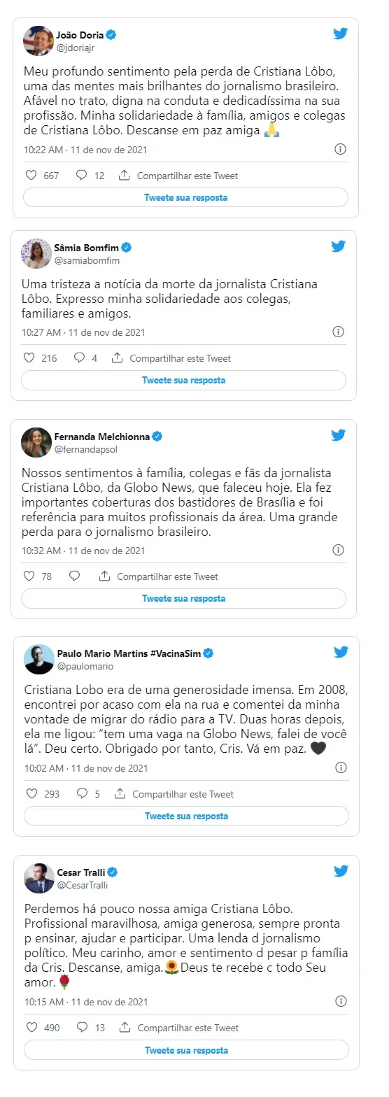 André Trigueiro, repórter e colega de emissora de Cristiana Lôbo, lamentou partida da amiga com mensagem no Twitter. "Consternado pela perda dessa grande jornalista e amiga! Que Deus a abençoe e proteja, e console sua linda família!".