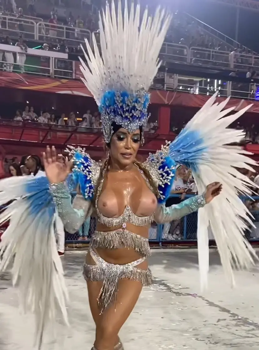 Mulher Abacaxi esquece parte de cima da fantasia e desfila com seios à mostra na Sapucaí