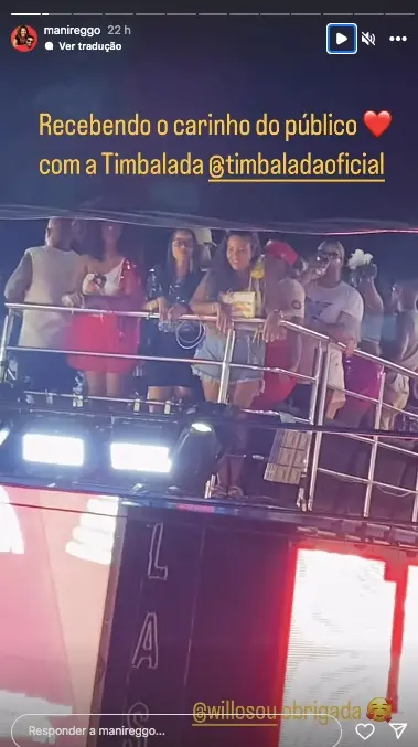 Com a popularidade de Davi, no “BBB 24”, Mani Reggo, esposa do brother, também virou celebridade em Salvador. Na sexta-feira (9), ela subiu no trio elétrico ao lado da Timbalada, durante o Carnaval, e tirou fotos e fez vídeos com pessoas que estavam curtindo as festa.
