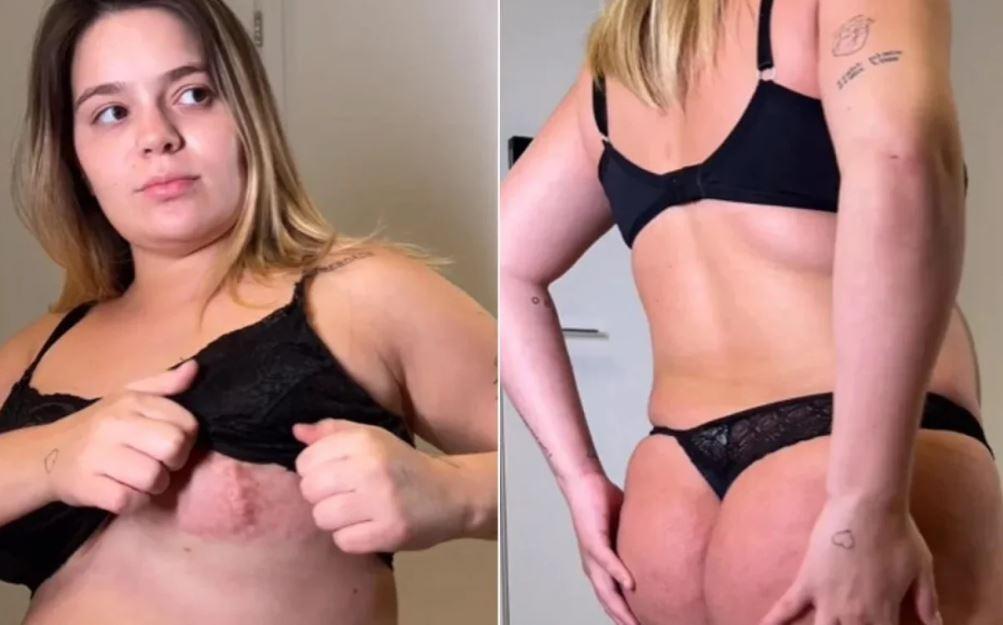 "'Bora' lá: primeira coisa que eu reparei foi minha auréola que cresceu e escureceu muito. Como eu não posso mostrar ela aqui para você, estou mostrando minha cicatriz, que também ganhou muita pigmentação, seguindo a auréola, o que é completamente normal e hormonal", explicou.