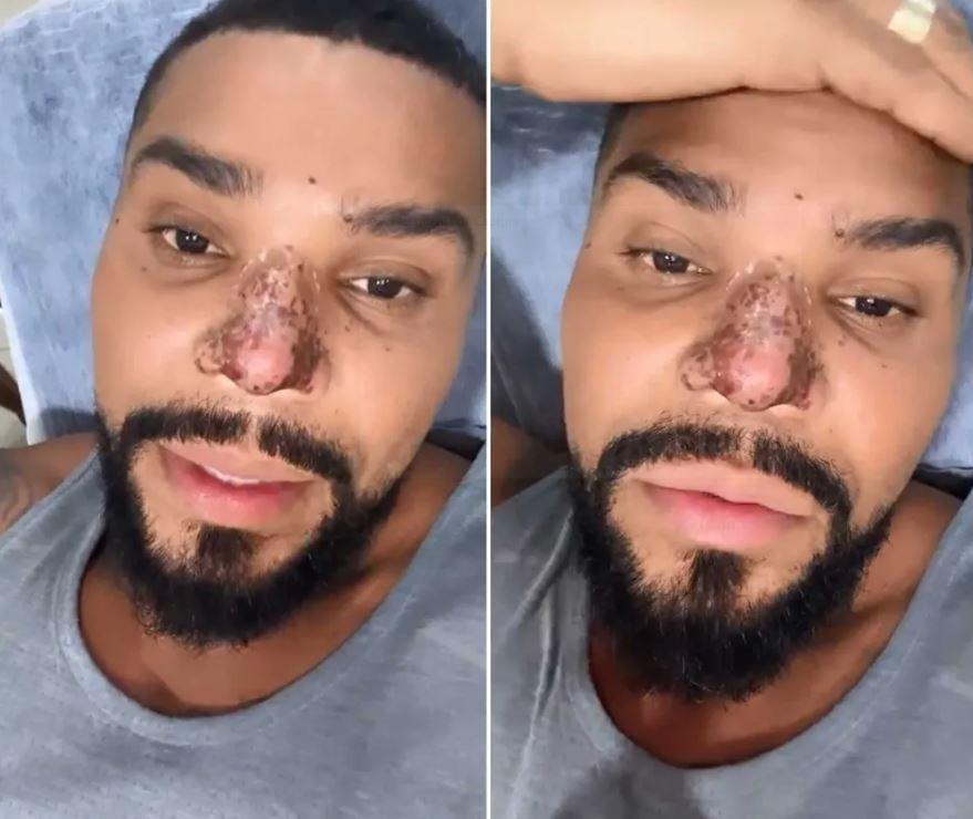 Nas imagens, é possível ver o nariz com manchas escuras e uma série de machucados, além de um inchaço por conta da cirurgia.