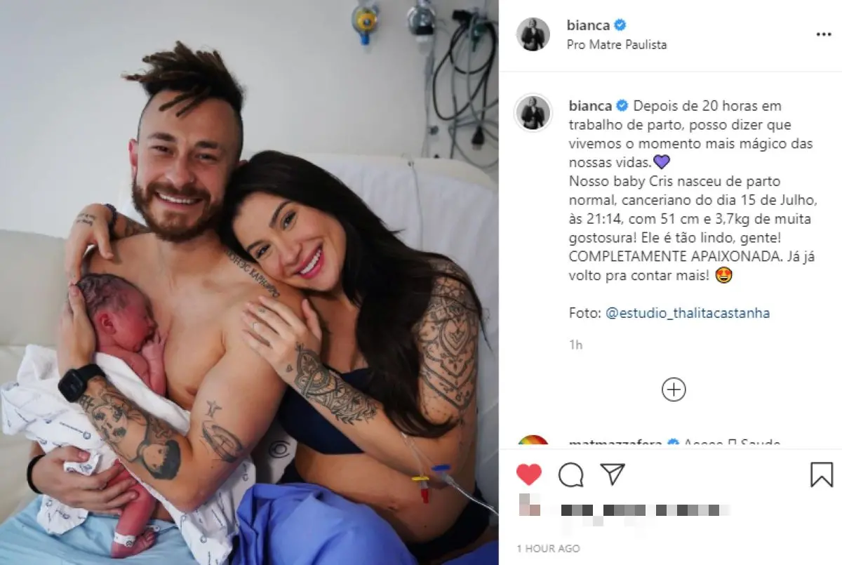 Nesta sexta, antes de anunciar o nascimento de Cris, Bianca publicou foto ao lado de Fred já no hospital Pro Matre, em São Paulo.