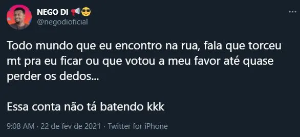 “Todo mundo que eu encontro na rua, fala que torceu muito para eu ficar, ou que votou a meu favor até quase perder os dedos… Essa conta não tá batendo”, escreveu no Twitter sobre o recorde. A publicação atingiu mais de 27 mil curtidas e ultrapassou a marca de oito mil comentários.